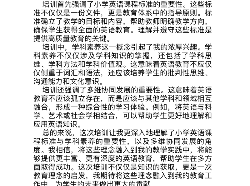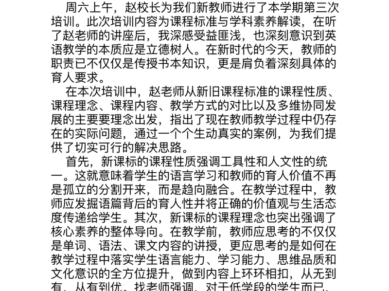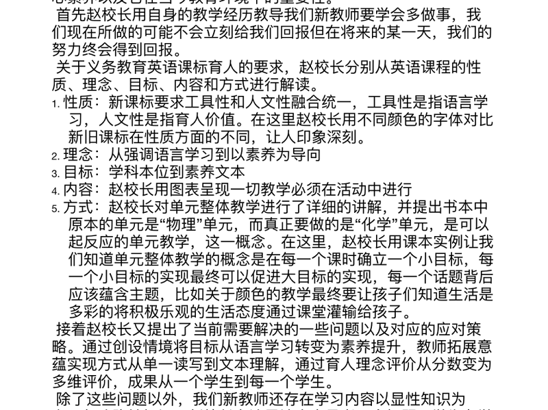 新课标重新定义了基础教育的发展方向,教师要与时间赛跑,深入学习课标,为今后的教学赋能。通过此次培训活动,新教师进一步确立了熟读课标,研究课标,领悟课标,践行课标的理念,能以更广阔的视野、更高的起点,面向未来的小学英语教学工作。以本次培训为契机,相信新教师会学思并进,满载而归;走深走实,行稳致远。