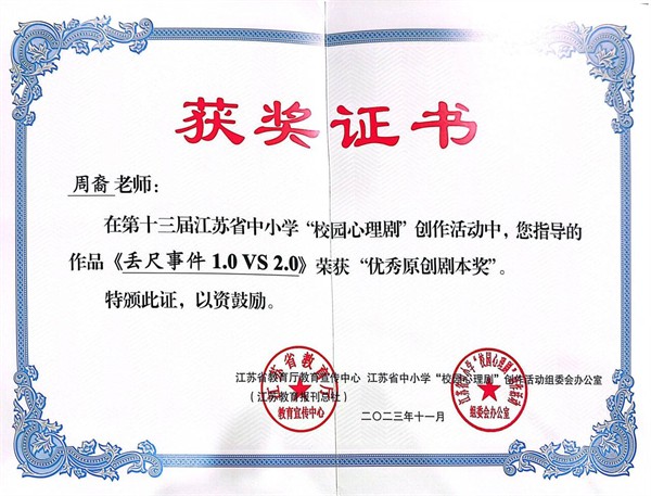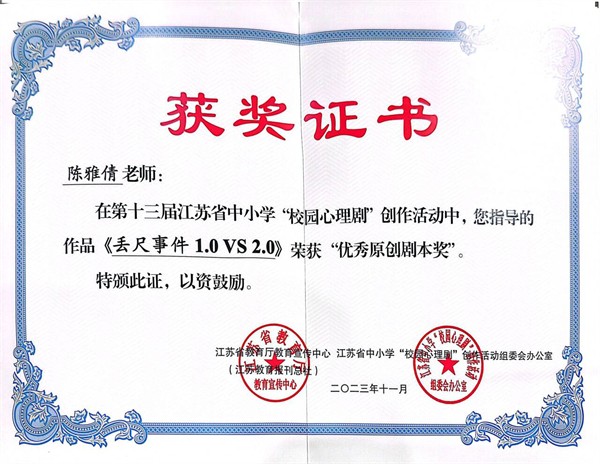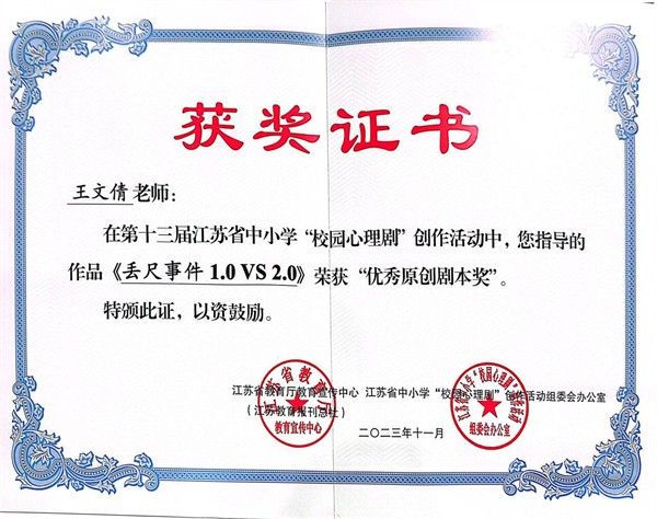 第十三届江苏省中小学“校园心理剧”优秀原创剧本奖喜报