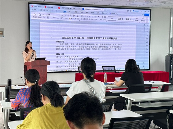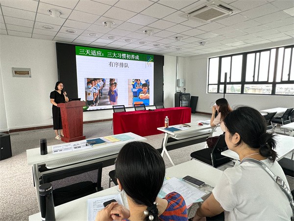 会议分为三个议程:钟刚副校长的开学寄语,希望全体一年级老师们,要像妈妈对孩子那样给予呵护与教导。周敏副校长介绍了“三天适应课程”。德育处杨艳、周裔教师开设了“培养习惯,遇见美好”的主题培训。